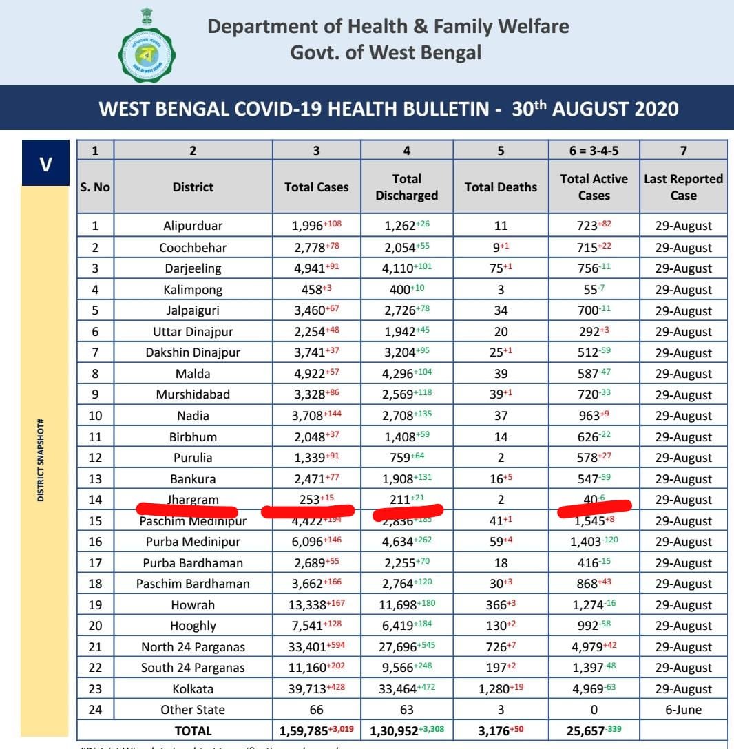 ঝাড়গ্রাম নিউজ ফ্ল্যাশ ডেস্ক : একদিনে ঝাড়গ্রাম জেলায় নতুন করে ১৫ জনের করোনা পজেটিভের হদিশ মিলল। এর ফলে ঝাড়গ্রাম জেলায় মোট করোনা আক্রান্তের সংখ্যা হয়ে দাঁড়াল ২৫৩। রবিবার ৩০ আগস্ট রাজ্য স্বাস্থ্যদপ্তর থেকে প্রকাশিত বুলেটিনে নতুন করে ১৫ জনের করোনা পজেটিভের কথা উল্লেখ করা হয়েছে। সেখানে উল্লেখ রয়েছে গত ২৯ আগস্ট পর্যন্ত যে স্যাম্পল নেওয়া হয়েছিল তার ভিত্তিতে এই রিপোর্ট। এমনকি ওই রিপোর্টে উল্লেখ করা হয়েছে ইতিমধ্যে পূর্বের যে ২১১ জনের করোনা পজেটিভ ধরা পড়েছিল তাঁদের চিকিৎসার পর ছেড়ে দেওয়া হয়েছে। এমনকি জেলায় করোনায় আক্রান্ত হয়ে ২ জনের মৃত্যুর খবর সরকারি ভাবে উল্লেখ করা হয়েছে বুলেটিনে। যার ফলে বর্তমানে ঝাড়গ্রাম জেলায় মোট ৪০ জন ব্যক্তির শরীরে করোনা পজেটিভ থাকার খবর জানানো হয়েছে রাজ্য স্বাস্থ্য দপ্তরের বুলেটিনে। যে ১৫ জনের নতুন করে করোনা পজেটিভের সন্ধান মিলেছে তাঁদের মধ্যে ঝাড়গ্রাম শহরের ৭ জন, বেলিয়াবেড়া ব্লকে ৪ জন, বেলপাহাড়ি ব্লকে ৩ জন, গোপীবল্লভপুরে ১ জন রয়েছেন।