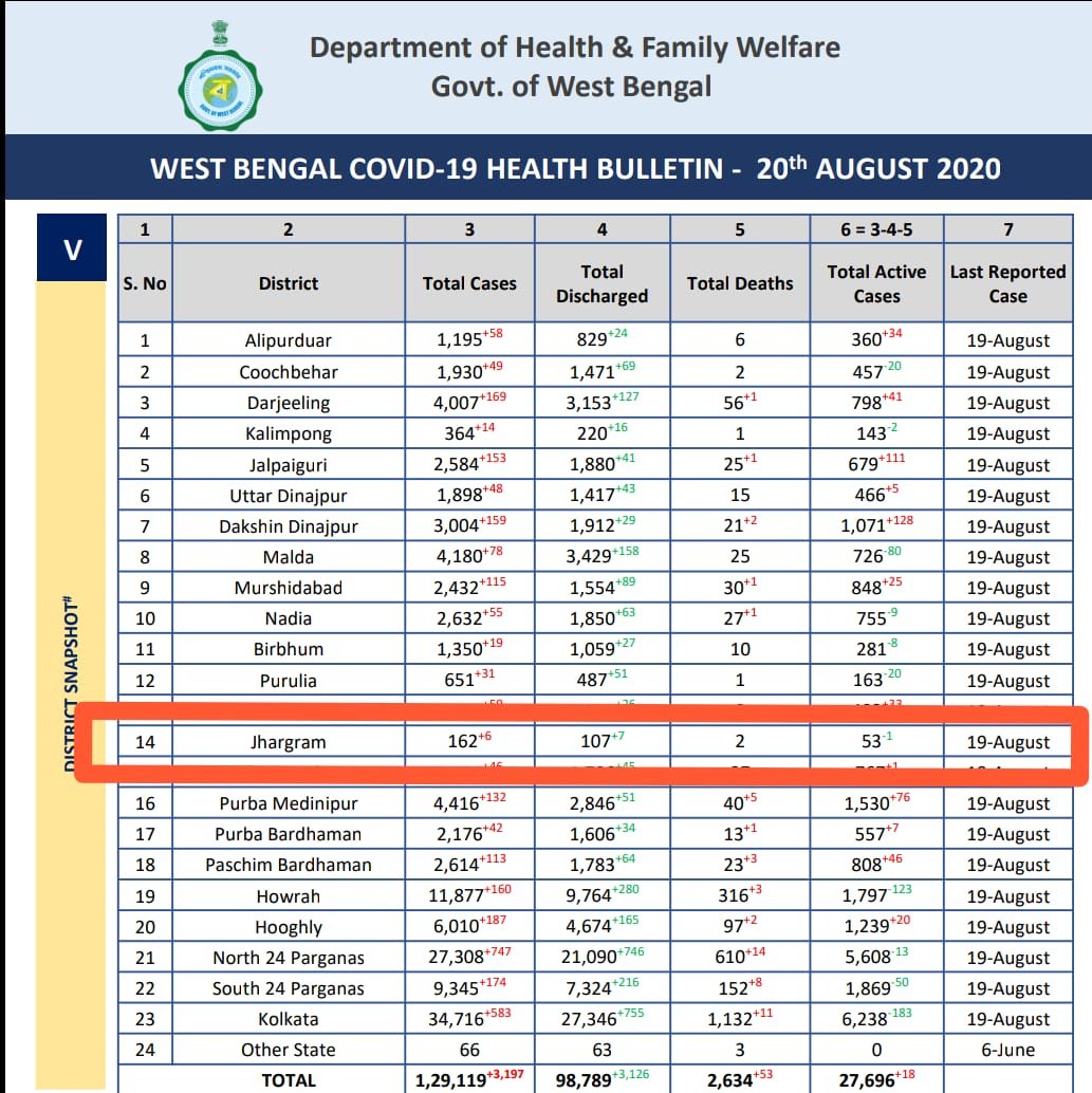 ঝাড়গ্রাম নিউজ ফ্ল্যাশ ডেস্ক : একদিনে ঝাড়গ্রাম জেলায় নতুন করে ৬ জনের করোনা পজেটিভের হদিশ মিলল। এর ফলে ঝাড়গ্রাম জেলায় মোট করোনা আক্রান্তের সংখ্যা হয়ে দাঁড়াল ১৬২। বৃহস্পতিবার ২০ আগস্ট রাজ্য স্বাস্থ্যদপ্তর থেকে প্রকাশিত বুলেটিনে নতুন করে ৬ জনের করোনা পজেটিভের কথা উল্লেখ করা হয়েছে। সেখানে উল্লেখ রয়েছে গত ১৯ আগস্ট পর্যন্ত যে স্যাম্পল নেওয়া হয়েছিল তার ভিত্তিতে এই রিপোর্ট। এমনকি ওই রিপোর্টে উল্লেখ করা হয়েছে ইতিমধ্যে পূর্বের যে ১০৭ জনের করোনা পজেটিভ ধরা পড়েছিল তাঁদের চিকিৎসার পর ছেড়ে দেওয়া হয়েছে। এমনকি জেলায় করোনায় আক্রান্ত হয়ে ২ জনের মৃত্যুর খবর সরকারি ভাবে উল্লেখ করা হয়েছে বুলেটিনে। যার ফলে বর্তমানে ঝাড়গ্রাম জেলায় মোট ৫৩ জন ব্যক্তির শরীরে করোনা পজেটিভ থাকার খবর জানানো হয়েছে রাজ্য স্বাস্থ্য দপ্তরের বুলেটিনে।