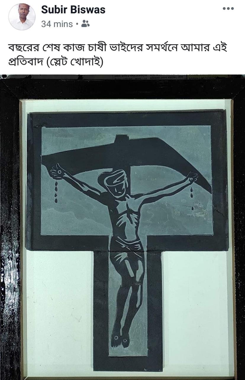 ঝাড়গ্রাম নিউজ ফ্ল্যাশ ডেস্ক : শিল্পীর বড় অস্ত্রই হল তাঁর শিল্পকর্ম। আর সেই শিল্পকর্ম কখনও কখনও হয়ে উঠে প্রতিবাদের ভাষা। বুধবার ঝাড়গ্রামের বিশিষ্ট স্লেট শিল্পী সুবীর বিশ্বাস ওরফে কচি নিজেই সোশ্যাল মিডিয়ায় সেই শিল্পকর্মের ছবি পোস্ট করেছেন। সেখানে দেখা যাচ্ছে, লাঙলে বিদ্ধ এক কৃষক। তার দু’হাত ও পায় দিয়ে ঝরছে রক্তের ফোঁটা। কিছুক্ষণ আগে পোস্ট হওয়া সেই শিল্পকর্মকে সর্মথন জানিয়ে কুর্নিশ জানিয়েছেন শিল্পী সুবীর বিশ্বাসকে।