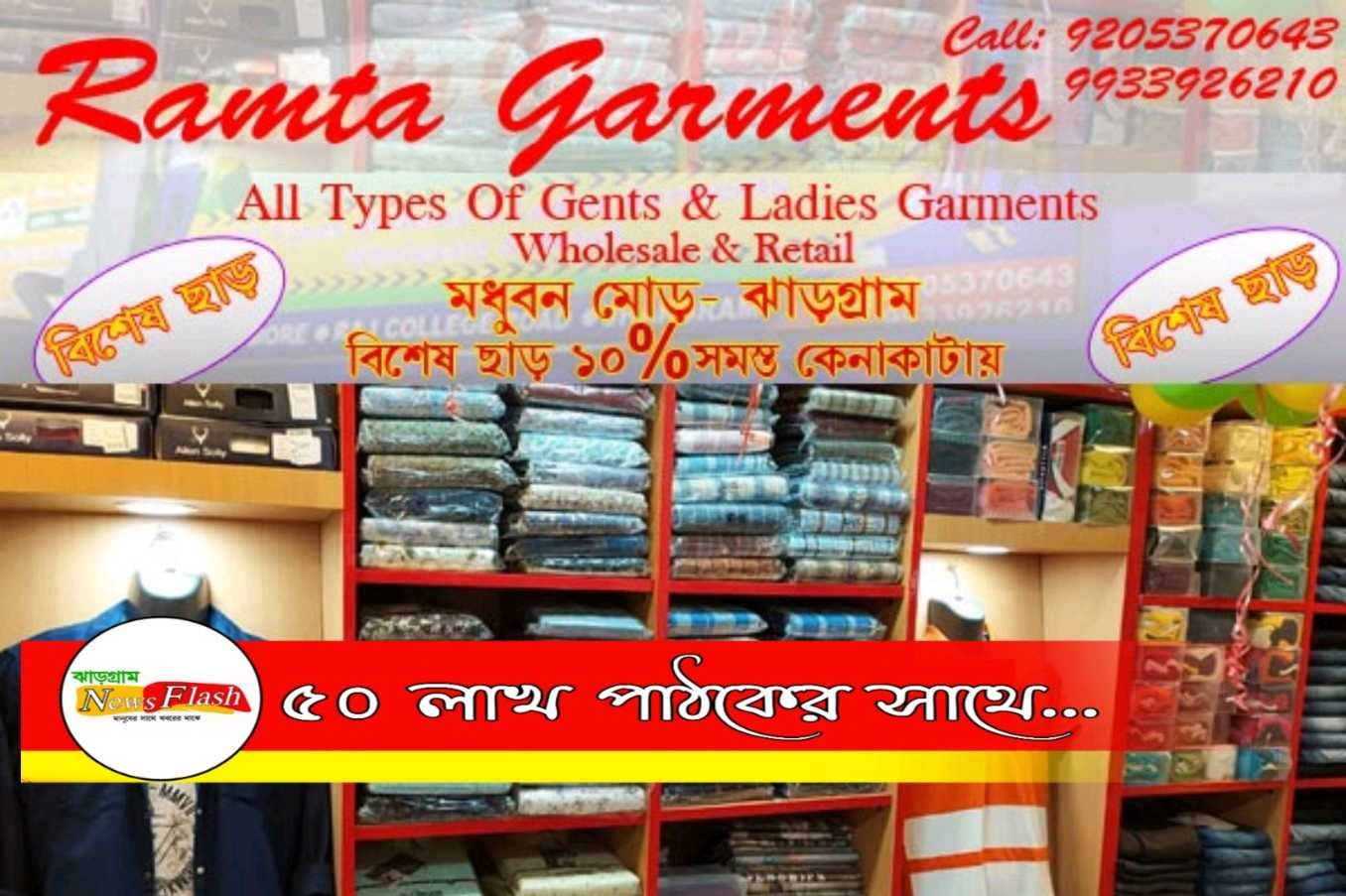ঝাড়গ্রাম নিউজ ফ্ল্যাশ ডেস্ক : ঝাড়গ্রাম শহরের মধুবন মোড়ে রামতা গার্মেন্টসে্র কেনাকাটায় ১০ শতাংশ বিশেষ ছাড়। গত মঙ্গলবার সন্ধ্যায় রামতা গার্মেন্টসে্র শুভ উদ্বোধন হয়। পাইকারি ও খুচরা সকল পুরুষ ও মহিলাদের পোষাক বিক্রির এক নতুন সম্ভার নিয়ে এসেছে। যুগের সঙ্গে তাল মিলিয়ে নিত্য নতুন পোষাক ও আধুনিক অভিজাত বস্ত্রের এক বিশাল সম্ভার রয়েছে। যা আপনার মন পছন্দের অবশ্যই নজর কাড়বে!