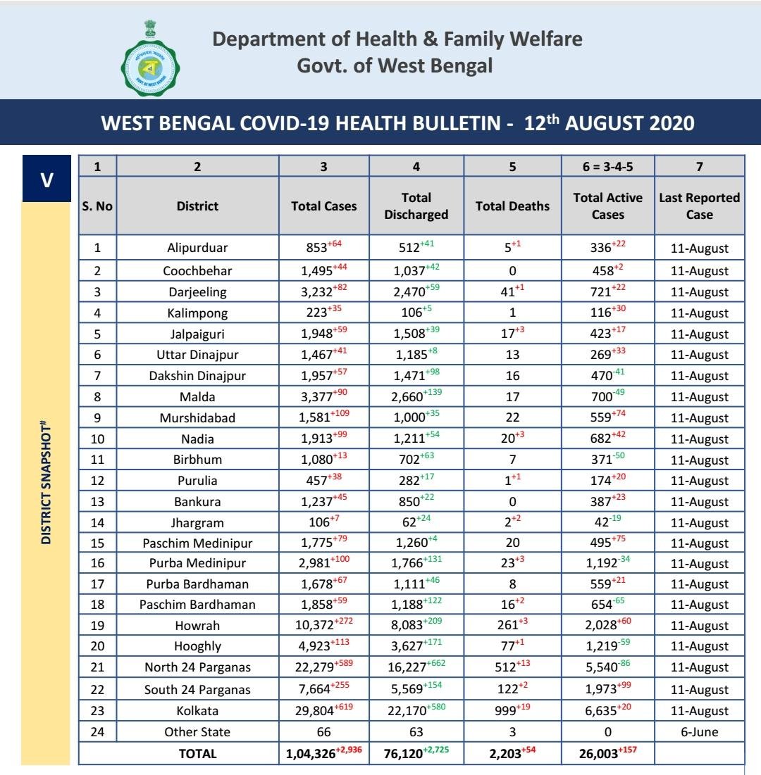ঝাড়গ্রাম নিউজ ফ্ল্যাশ ডেস্ক : ঝাড়গ্রাম জেলায় একদিনে সুস্থ হয়ে বাড়ি ফিরলেন ২৪ জন। আর নতুন করে করোনায় আক্রান্ত হলেন ৭ জন। যা কিছুটা হলেও স্বস্তির নিঃশ্বাস ফেলছে জেলাবাসী। বুধবার ১২ আগস্ট রাজ্য স্বাস্থ্যদপ্তর থেকে প্রকাশিত বুলেটিনে নতুন করে ৭ জনের করোনা পজেটিভের কথা উল্লেখ করা হয়েছে। সেখানে উল্লেখ রয়েছে গত ১১ আগস্ট পর্যন্ত যে স্যাম্পল নেওয়া হয়েছিল তার ভিত্তিতে এই রিপোর্ট। এ নিয়ে ঝাড়গ্রাম জেলায় সরকারি ভাবে মোট ১০৬ জনের করোনা পজেটিভ ধরা পড়েছে। এমনকি ওই রিপোর্টে উল্লেখ করা হয়েছে ইতিমধ্যে পূর্বের যে ৬২ জনের করোনা পজেটিভ ধরা পড়েছিল তাঁদের চিকিৎসার পর ছেড়ে দেওয়া হয়েছে। এমনকি জেলায় করোনায় আক্রান্ত হয়ে ২ জনের মৃত্যুর খবর সরকারি ভাবে এদিন উল্লেখ করা হয়েছে বুলেটিনে। যার ফলে বর্তমানে ঝাড়গ্রাম জেলায় মোট ৪২ জন ব্যক্তির শরীরে করোনা পজেটিভ থাকার খবর জানানো হয়েছে রাজ্য স্বাস্থ্য দপ্তরের বুলেটিনে।