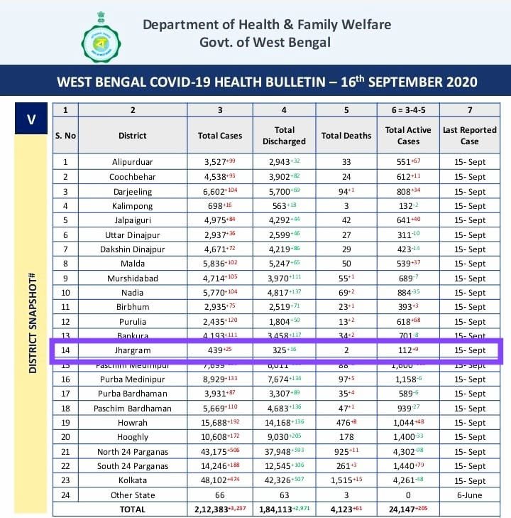 ঝাড়গ্রাম নিউজ ফ্ল্যাশ ডেস্ক : ঝাড়গ্রাম জেলায় বুধবার ২৫ জনের করোনা পজেটিভের হদিশ মিলল। এর ফলে ঝাড়গ্রাম জেলায় মোট করোনা আক্রান্তের সংখ্যা হয়ে দাঁড়াল ৪৩৯। বুধবার ১৬ সেপ্টেম্বর রাজ্য স্বাস্থ্যদপ্তর থেকে প্রকাশিত বুলেটিনে নতুন করে ২৫ জনের করোনা পজেটিভের কথা উল্লেখ করা হয়েছে। সেখানে উল্লেখ রয়েছে গত ১৫ সেপ্টেম্বর পর্যন্ত যে স্যাম্পল নেওয়া হয়েছিল তার ভিত্তিতে এই রিপোর্ট। এমনকি ওই রিপোর্টে উল্লেখ করা হয়েছে ইতিমধ্যে পূর্বের যে ৩২৫ জনের করোনা পজেটিভ ধরা পড়েছিল তাঁদের চিকিৎসার পর ছেড়ে দেওয়া হয়েছে। এমনকি জেলায় করোনায় আক্রান্ত হয়ে ২ জনের মৃত্যুর খবর সরকারি ভাবে উল্লেখ করা হয়েছে বুলেটিনে। যার ফলে বর্তমানে ঝাড়গ্রাম জেলায় মোট ১১২ জন ব্যক্তির শরীরে করোনা পজেটিভ থাকার খবর জানানো হয়েছে রাজ্য স্বাস্থ্য দপ্তরের বুলেটিনে। ২৫ জনের নতুন করে যে করোনা পজেটিভের সন্ধান মিলেছে তাঁর মধ্যে বেশির ভাগই কোভিড যোদ্ধা পুলিশ কর্মী।