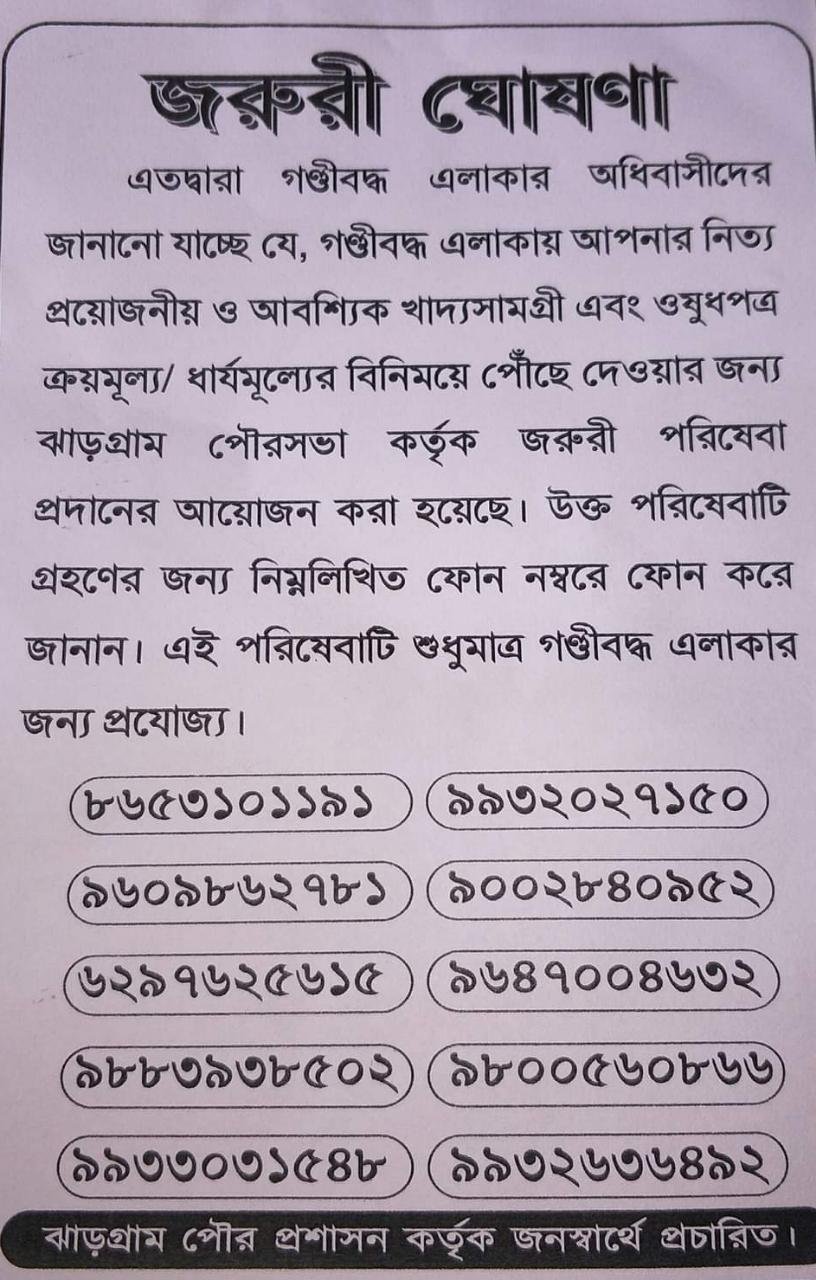 ঝাড়গ্রাম শহরের কন্টেনমেন্ট জোনের বাসিন্দাদের পরিষেবা প্রদানের জন্য ১০ টি মোবাইল নম্বর চালু করল পুরসভা