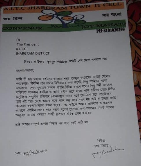 ঝাড়গ্রাম নিউজ ফ্ল্যাশ ডেস্ক : মঙ্গলবার সন্ধ্যায় ঝাড়গ্রাম শহর তৃণমূলের আইটি সেলের কনভেনার জয় মাহাত তাঁর পদত্যাগ পত্র সোশ্যাল মিডিয়ায় শেয়ার করলেন। যা নিয়ে দাবি ও পাল্টা দাবিতে সরগরম হল তৃণমূলের অন্দর! নিজের দলীয় প্যাডে আজ ২৯ ডিসেম্বর তারিখ লেখা ও তাঁর স্বাক্ষর করা জয় মাহাত লিখেছেন,‘দীর্ঘদিন ধরে দলের বিভিন্ন স্তরে কাজ করেছি। কিন্তু বর্তমানে দলের অভ্যন্তরে কোন নূন্যতম সম্মান পাইনি। বিভিন্ন কারনে দলের কিছু কর্মী আমাকে ব্যক্তিগত আক্রমন করছিল ও আমি স্বাধীন ভাবে দলের কাজ চালিয়ে যেতে বিভিন্ন অসুবিধার সম্মুখীন হচ্ছিলাম। দলের সকল স্তরের নেতা কর্মীকে আমার ভালোবাসা ও ধন্যবাদ আমাকে এতদিন দলের কাজ করার সুযোগ দেওয়ার জন্য। স্ব-ইচ্ছায় আমি আইটি সেল থেকে পদত্যাগ করলাম।’ যদিও পদত্যাগ বিষয়ে ঝাড়গ্রাম জেলা তৃণমূলের চেয়ারম্যান বীরবাহা সোরেন বলেন,‘বেশ কিছু দিন ধরে দলবিরোধী কাজকর্ম করছিল। সে জন্য দলের আইটি সেল থেকে বহিস্কার করা হয়েছে। পদত্যাগ করেনি।’