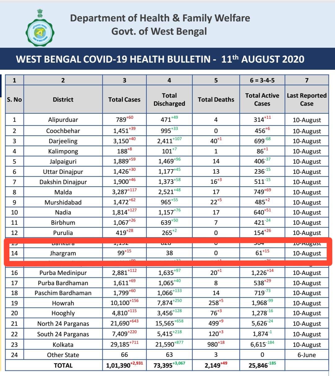 ১০ আগস্ট পর্যন্ত যে স্যাম্পল নেওয়া হয়েছিল তার ভিত্তিতে এই রিপোর্ট। এ নিয়ে ঝাড়গ্রাম জেলায় সরকারি ভাবে মোট ৯৯ জনের করোনা পজেটিভ ধরা পড়েছে। বলা যেতে পারে সেঞ্চুরির দোরগোড়ায় দাঁড়িয়ে ঝাড়গ্রাম জেলা! এমনকি ওই রিপোর্টে উল্লেখ করা হয়েছে ইতিমধ্যে পূর্বের যে ৩৮ জনের করোনা পজেটিভ ধরা পড়েছিল তাঁদের চিকিৎসার পর ছেড়ে দেওয়া হয়েছে। যার ফলে বর্তমানে ঝাড়গ্রাম জেলায় মোট ৬১ জন ব্যক্তির শরীরে করোনা পজেটিভ থাকার খবর জানানো হয়েছে রাজ্য স্বাস্থ্য দপ্তরের বুলেটিনে। ঝাড়গ্রাম জেলায় নতুন করে যে ১৫ জনের করোনা পজেটিভ ধরা পড়েছে, তার মধ্যে খোদ ঝাড়গ্রাম শহরে রয়েছে ২ জন, বিনপুরে ৭ জন এবং কুই এলাকায় ৬ জন।