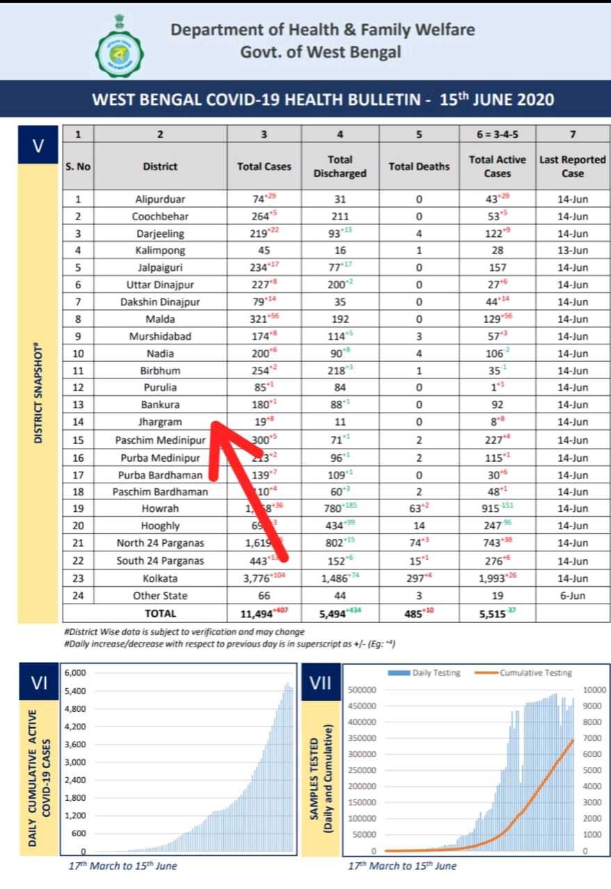 ঝাড়গ্রাম নিউজ ফ্ল্যাশ ডেস্ক : সোমবার ঝাড়গ্রাম জেলায় নতুন করে ফের ৮ জনের করোনা পজেটিভের হদিশ মিলল। ১৫ জুন রাজ্য স্বাস্থ্যদপ্তর থেকে প্রকাশিত বুলেটিনে নতুন করে ফের ৮ জনের করোনা পজেটিভের কথা উল্লেখ করা হয়েছে। সেখানে উল্লেখ রয়েছে গত ১৪ জুন পর্যন্ত যে স্যাম্পল নেওয়া হয়েছিল তার ভিত্তিতে এই রিপোর্ট। এ নিয়ে ঝাড়গ্রাম জেলায় সরকারি ভাবে মোট ১৯ জনের করোনা পজেটিভ ধরা পড়েছে। এমনকি ওই রিপোর্টে উল্লেখ করা হয়েছে ইতিমধ্যে পূর্বের যে ১১ জনের করোনা পজেটিভ ধরা পড়েছিল, তাঁদের চিকিৎসার পর ছেড়ে দেওয়া হয়েছে। যার ফলে বর্তমানে ঝাড়গ্রাম জেলায় মোট ৮ জন ব্যক্তির শরীরে করোনা পজেটিভ থাকার খবর জানানো হয়েছে রাজ্য স্বাস্থ্য দপ্তরের বুলেটিনে।