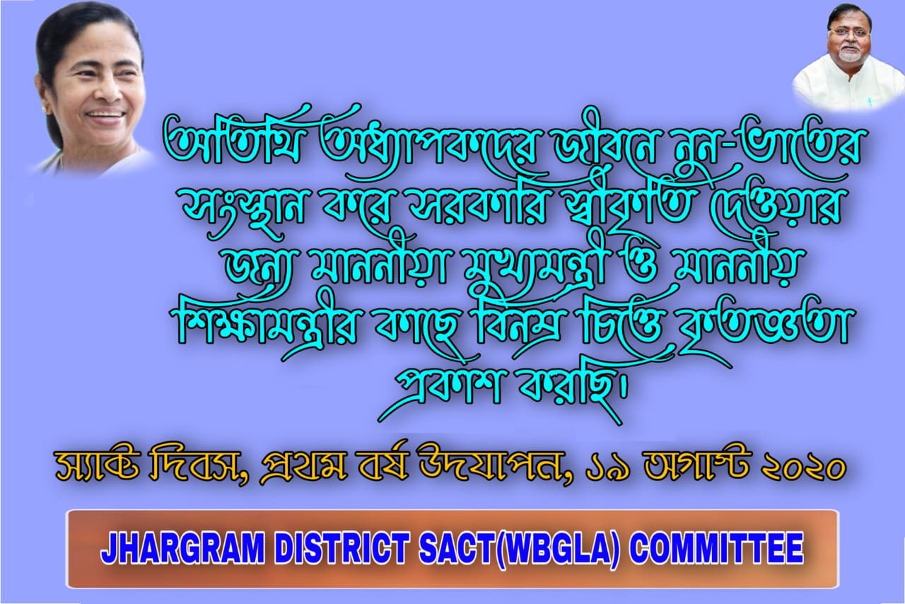 ঝাড়গ্রাম নিউজ ফ্ল্যাশ ডেস্ক : প্রথম বর্ষ ‘স্যাক্ট’ দিবসে রাজ্যের মুখ্যমন্ত্রী ও শিক্ষামন্ত্রীর কাছে কৃতজ্ঞতা প্রকাশ করল ঝাড়গ্রাম জেলা অতিথি অধ্যাপক সমিতি অর্থাৎ স্যাক্ট-ডাব্লুবিজেএলএ। রাজ্যের কলেজ গুলি নূন্যতম ৩-৪ হাজার টাকা মাসিক বেতনের বিনিময়ে পড়ুয়াদের শিক্ষা দিয়ে এসেছেন অতিথি অধ্যাপকরা। কোন কলেজ মাসে আবার কোন কলেজ ক্লাস অনুপাতে বেতন প্রদান করত। সেই যন্ত্রণা থেকে মুক্তি দিয়ে হাওড়ার এক প্রশাসনিক বৈঠকে মুখ্যমন্ত্রী মমতা বন্দ্যোপাধ্যায় ১৯ অগাস্ট ২০১৯ সালে প্রথম ‘স্যাক্ট’ ঘোষণা করেন। এদিনটিকে স্মরণীয় করে রাখতে ঝাড়গ্রাম জেলার কলেজের অতিথি অধ্যাপকরা সোশ্যাল মিডিয়ায় কৃজ্ঞতা স্বরূপ পোস্ট করেছেন। সেখানে লেখা রয়েছে,”অতিথি অধ্যাপকদের জীবনে নুন-ভাতের সংস্থান করে সরকারি স্বীকৃতি দেওয়ার জন্য মাননীয়া মুখ্যমন্ত্রী ও মাননীয় শিক্ষামন্ত্রীর কাছে বিনম্র চিত্তে কৃতজ্ঞতা প্রকাশ করছি।” আবার কোথাও লেখা রয়েছে,’এক বৈপ্লবিক রূপান্তরের প্রথম বর্ষ’।