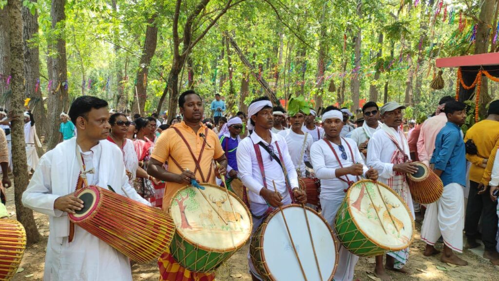 প্রথমে কালীপদ ধামসা বাজাতে শুরু করেন। তারপর প্রণত ধামসা বাজাতে শুরু করেন। তারপর বাপি রেগড়া বাজাতে শুরু করেন। কিন্তু প্রণত ও বাপি পাশাপাশি থাকলেও কালীপদ একপাশে ছিলেন। প্রণত পরে বাজাতে শুরু করলেও একসময় প্রণতের পিছনে পড়ে যান কালীপদ। প্রণতকে ঘিরে সবাই ধামসা মাদল বাজাতের থাকে । কিছুক্ষণ পর কালীপদ ধামসা বাজানো ছেড়ে দেন। কালীপদ ছেড়ে দিলেও প্রণত ও বাপি দু’জনেই বাজাচ্ছিলেন। দু’জনের সঙ্গে নাচের তালে নাচ করছিলেন মন্ত্রী বিরবাহা হাঁসদার মা চুনিবালা হাঁসদা। নাচ এবং ধামসা মাদলের তালে যখন সবাই মেতে উঠেছিল তখন কালীপদ ভীড় থেকে সরে এসে পুজো দেখতে শুরু করেন। এদিন ধর্মীয় অনুষ্ঠানে বাজনা বাজানোর পাশাপাশি নিজেদের দলের সঙ্গী দের নিয়ে প্রত্যেক প্রার্থী সময় মত জনসংযোগ পর্বও সারেন । এমনকি পরে আদিবাসী মানুষদের কাছে মন পেতে প্রণত মাথায় কাপড় বেঁধে শালগাছের ডাল গুঁজে তাঁদের সাথে ধামসা মাদল বাজান । রাজনৈতিক মহলের একাংশের দাবি, একটি সমাজের ধর্মীয় অনুষ্ঠানে ওই সমাজের মানুষের উপস্থিতি থাকবে চোখে পড়ার মতোই, আজ সেই উপস্থিতির ভীড়কে কেউ হালকাভাবে না নিয়ে তিন প্রার্থীই নিজেদেরকে সকাল সকাল ওই ধর্মীয় অনুষ্ঠানে উপস্থিত করলেন। এবং পূজা অর্চনার আড়ালে প্রচার এবং জনসংযোগ পর্বও সারলেন এবং একে অপরের উপস্থিতি নিয়ে কটাক্ষ করতেও পিছপা হলেন না তিন প্রার্থী।তৃণমূলের প্রার্থী কালীপদ সোরেন বলেন, “এটা আমার গ্রামের মত। আমি এখানে বরাবরই আসি। বিজেপি প্রার্থী তো কোনও দিনই এখানে আসেন না। ভোটের জন্য এখানে এসেছেন”।আইএসএফ প্রার্থীকে কটাক্ষ করে কালীপদ বলছেন, “উনি পরিযায়ী পাখি। ভোট ফুরোলে পরে আর দেখা পাওয়া যাবে না”।