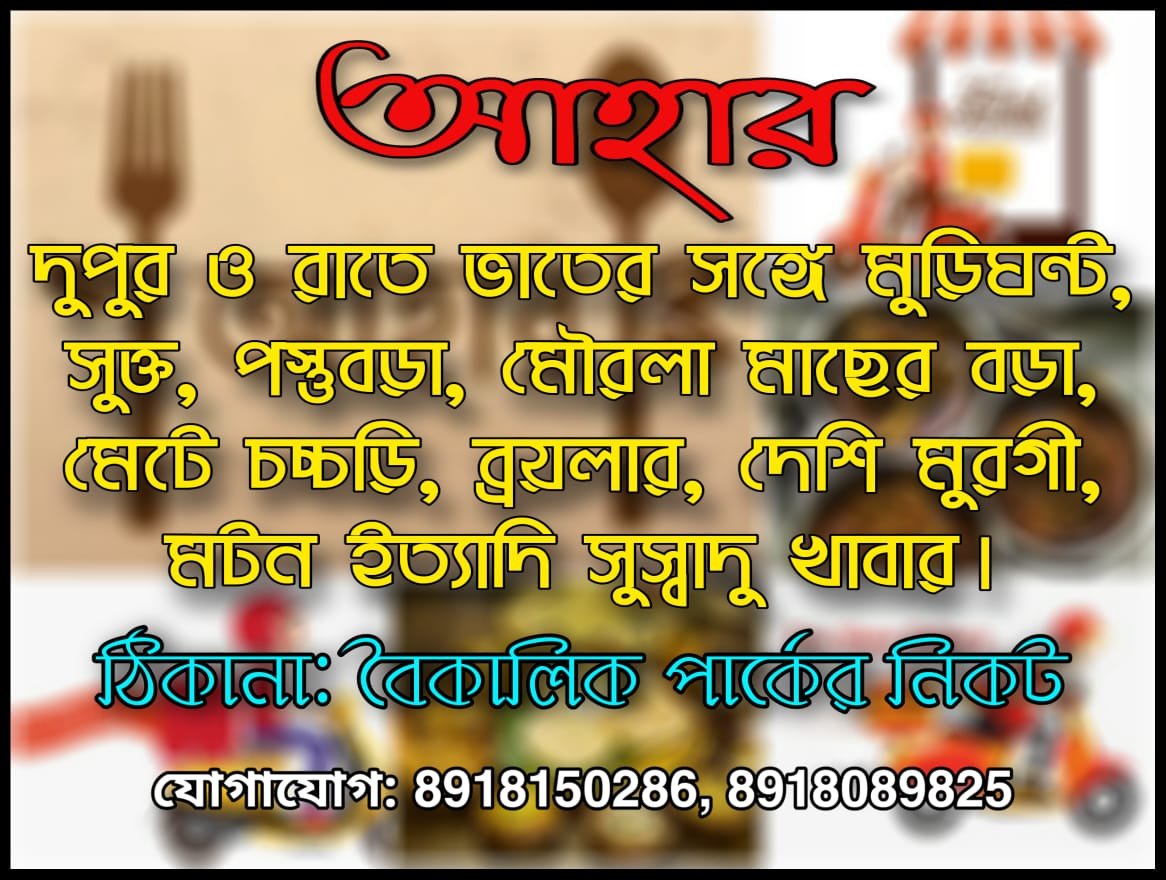 ঝাড়গ্রাম নিউজ ফ্ল্যাশ ডেস্ক : সুলভ মূল্যে সুস্বাদু খাবারের হোম ডেলিভারী ঝাড়গ্রাম শহরে চালু হচ্ছে ১লা সেপ্টেম্বর থেকে। এখানে অর্ডার দিলে আপনি দুপুরের লাঞ্চ এবং রাতের ডিনার পাবেন বাড়িতে বসেই। দুপুরের খাবারের জন্য সকাল সাড়ে আটটা এবং রাতের খাবারের জন্য বিকেল সাড়ে পাঁচটার মধ্যে অর্ডার দিতে হবে। দুপুর ও রাতে ভাতের সঙ্গে মুড়িঘন্ট, সুক্ত, পস্তুবড়া, মৌরলা মাছের বড়া, মেটে চচ্চড়ি, ব্রয়লার, দেশি মুরগী, মটন ইত্যাদি সুস্বাদু খাবার। এছাড়াও আপনার বাড়ির অনুষ্ঠানে ক্যাটারিং এর ব্যবস্থাও রয়েছে। আজই যোগাযোগ করুন বৈকালিক পার্কের নিকট এই ফোন নাম্বারে 8918150286 ও 8918089825।