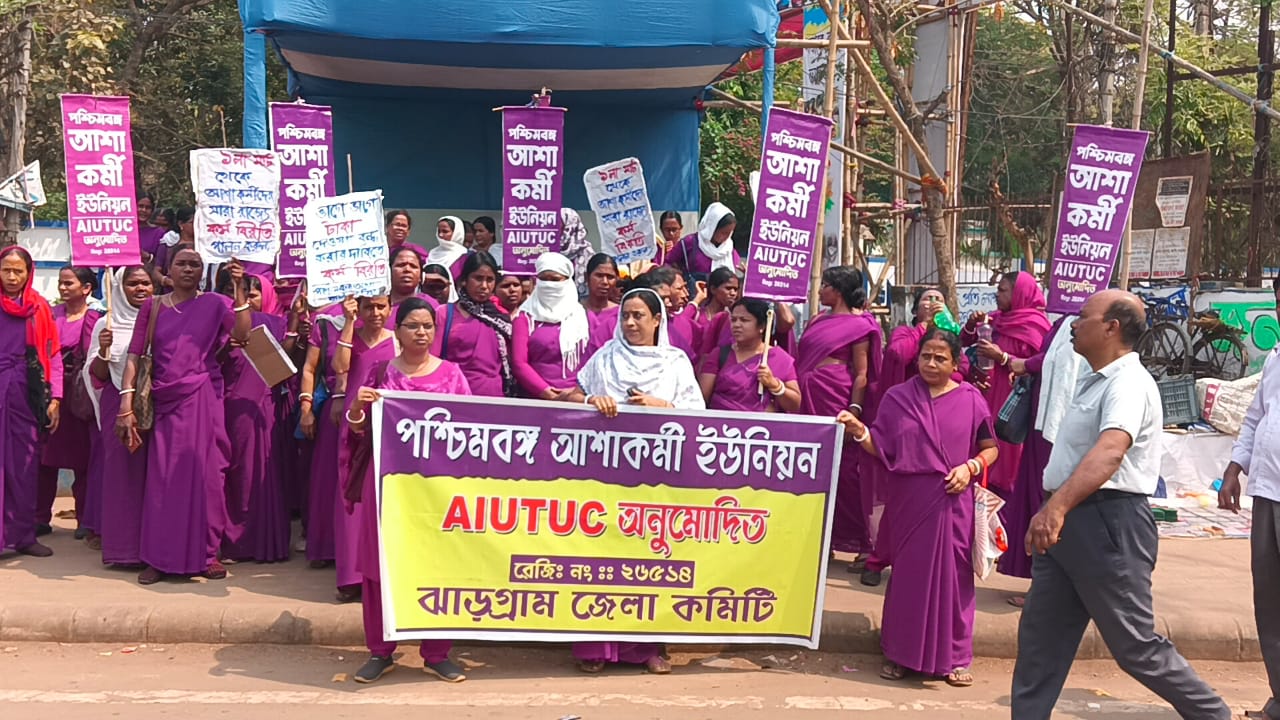 জেএনএফ ওয়েব ডেস্ক : মাসিক ভাতা বৃদ্ধি, স্মার্ট ফোন প্রদান এবং বকেয়া টাকা অবিলম্বে প্রদানের দাবি কে সামনে রেখে চলতি বছরের মার্চ মাসের এক তারিখ থেকে কর্মবিরতি পালন করছে আশাকর্মীরা । কর্মবিরতির সমর্থনে রবিবার সকাল ১১টার সময় ঝাড়গ্রাম শহরে মিছিল এবং পথসভা করে AIUTUC অনুমোদিত পশ্চিমবঙ্গ আশাকর্মী ইউনিয়ন । পশ্চিমবঙ্গ আশাকর্মী ইউনিয়নের ঝাড়গ্রাম জেলা কমিটির পক্ষ থেকে এদিনের এই মিছিল ও পথসভা করা হয় ।