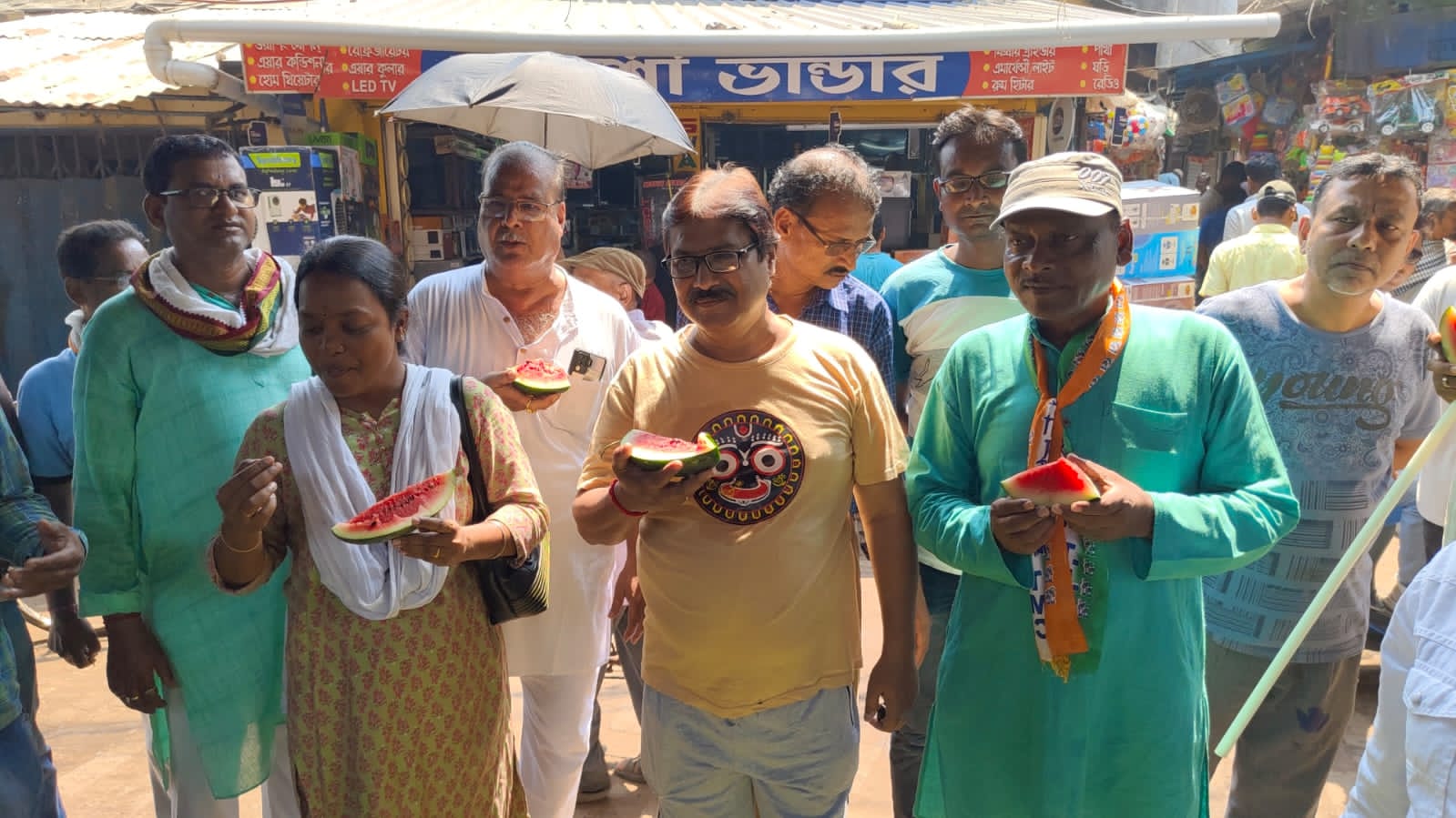বুদ্ধদেব বেরা ,জেএনএফ,ঝাড়গ্রাম: আর পাঁচটা লোকসভা কেন্দ্রের মতো ঝাড়গ্রামে ভোটের উত্তাপ নেই । কিন্তু গরমের দাপটে হাঁসফাঁস করছে ঝাড়গ্রাম। দিনের বেলায় ৪২ থেকে ৪৫ ডিগ্রি সেলসিয়াস তাপমাত্রা বিরাজ করছে । আর এই গরমকে উপেক্ষা করেই তরমুজের উপর ভরসা রেখেই জোর কদমে প্রচার চালাচ্ছে তৃণমূল । প্রচারের কৌশলও বদলে ফেলেছে তৃণমূল কংগ্রেস । সকাল এবং বিকালে প্রচার করছে তারা । ঝাড়গ্রাম লোকসভা কেন্দ্রের তৃণমূল কংগ্রেসের প্রার্থী কালিপদ সরেন শনিবার সকালে ঝাড়গ্রাম শহরের জুবলি মার্কেট, সবজি মার্কেট, মাছ মার্কেট ও কোর্ট রোড চত্বরে ভোট প্রচার করেন । সঙ্গে ছিলেন রাজ্যের মন্ত্রী বীরবাহা হাঁসদা ঝাড়গ্রাম পৌরসভার চেয়ারম্যান কবিতা ঘোষ, ঝাড়গ্রাম শহর তৃণমূল কংগ্রেসের শহর সভাপতি নবু গোয়ালা, ঝাড়গ্রাম জেলা তৃণমূল কংগ্রেসের সাধারণ সম্পাদক অজিত মাহাতো, বিশ্বরঞ্জন মুখার্জি, ৭ নম্বর ওয়ার্ডের কাউন্সিলর গোবিন্দ সোমানি, ৬ নম্বরের কাউন্সিলর বিপ্লব সিট, ১৮ নম্বর ওয়ার্ডের কাউন্সিলর গৌতম মাহাতো, রাজ্যের প্রাক্তন মন্ত্রী চূড়ামণি মাহাতো সহ তৃণমূলের একাধিক নেতৃত্বরা । এদিন তৃণমূলের প্রার্থী কালীপদ বাবু সবজি মার্কেটে গিয়ে সবজির দর, মাছ মার্কেটে মাছের দর, ফল মার্কেটে ফলের দাম জিজ্ঞেস করেন । কোন সমস্যা রয়েছে কিনা সেই প্রসঙ্গে জানতে চান তিনি । ঝাড়গ্রাম জুবলি মার্কেটের ব্যবসায়ীরা প্রার্থী ও মন্ত্রীর কাছে মার্কেটে ঢোকার জন্য ভালো রাস্তা নির্মাণের জন্য দাবি জানান। ভোটের পর রাস্তার দাবী পূরণ করার আশ্বাস দেন প্রার্থী । ভোট প্রচার এর মধ্যেই শরীরকে ঠান্ডা রাখার জন্য তরমুজকে হাতিয়ার করে নেন প্রার্থী ও উপস্থিত সকলেই । প্রথমে সুভাষ পার্কে ফলের দোকান থেকে তরমুজ নিয়ে সকলে ভাগাভাগি করে খায়। তারপর জুবলি মার্কেটের ভেতরে প্রচারের শেষে লোকাল বোর্ড চত্বরে সকলে মিলে জমিয়ে তরমুজ খাওয়া দাওয়া করে । মন্ত্রী বীরবাহা হাঁসদা বলেন,”আমরা তো মাঠে-ঘাটে খেটে খাওয়া মানুষজন। এই এলাকায় গরমের জন্য আমাদেরকে বিশেষ কিছু করতে হয় না। কিন্তু কর্মীদেরকে বারে বারে বলা হচ্ছে প্রচুর পরিমাণে জল খেতে হবে এবং আমরা আজ প্রচারে বেরিয়ে প্রচুর তরমুজ খেলাম সকলে মিলে ।সাধারণ মানুষজন আমাদের দিকে বাড়িয়ে দিচ্ছে এটা দেখে খুব ভালো লাগলো। মানুষ এখানে আমাদের পাশে রয়েছে”। প্রার্থী কালিপদ সরেন বলেন,”গরমকে মেনে নিও আমাদের প্রচার চালিয়ে যেতে হবে। আজ সকালে ঝাড়গ্রাম বাজারে প্রচার করলাম মানুষের সঙ্গে কথা বললাম বাজার দর সম্পর্কে জানলাম আর সবচেয়ে বড় কথা শরীরকে ঠান্ডা রাখার জন্য ঠান্ডা জল ও ওআরএস আমরা খাচ্ছি তার পাশাপাশি শরীরকে আরো সতেজ রাখার জন্য আমরা প্রচুর পরিমাণে তরমুজ খাচ্ছি । আজ আমরা সকলে মিলে প