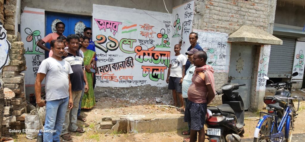 ঝাড়গ্রাম: ২১শে জুলাই তৃণমূল কংগ্রেসের শহীদ স্মরণে কলকাতার ধর্মতলায় জনসভা রয়েছে মুখ্যমন্ত্রী মমতা বন্দ্যোপাধ্যায়ের। ২১শে জুলাই এর জনসভাকে সাফল্যমন্ডিত করার লক্ষ্যে বৃহস্পতিবার দুপুরে ঝাড়গ্রাম ব্লকের রাধানগর গ্রাম পঞ্চায়েতের অন্তর্গত সেবায়তন এলাকায় দেওয়াল লিখন করা হয়। রাধানগর অঞ্চল তৃণমূল কংগ্রেসের অঞ্চল সভাপতি বিদ্যুৎ ঘোষের নেতৃত্বে রাধানগরের সেবায়তন সহ একাধিক এলাকায় দেওয়াল লিখন করা হয় এদিন। দেওয়াল লেখনের পাশাপাশি রাধানগর অঞ্চল তৃণমূল কংগ্রেসের নেতৃত্বদের সঙ্গে ২১শে জুলাই কে সামনে রেখে গুরুত্বপূর্ণ আলোচনা করেন অঞ্চল সভাপতি বিদ্যুৎ ঘোষ । এদিনের এই কর্মসূচিতে উপস্থিত ছিলেন, রাধানগর অঞ্চল সভাপতি বিদ্যুৎ ঘোষ সহ রাধানগর গ্রাম পঞ্চায়েতের প্রধান কবিতা মুদি, রাধানগর গ্রাম পঞ্চায়েতের উপপ্রধান জয়ন্ত মাহাত,কেচন্দা বুথের পঞ্চায়েত সদস্য আশিষ মাইতি,ঝাড়গ্রাম ব্লক তৃণমূল যুব কংগ্রেসের প্রত্তন সভাপতি অশোক মাহাত, ঝাড়গ্রামের তৃণমূলের বিশিষ্ট নেতা পরিতোষ মাহাতো সহ অন্যান্য নেতৃত্বরা। রাধানগর অঞ্চল তৃণমূল কংগ্রেসের অঞ্চল সভাপতি বিদ্যুৎ ঘোষ বলেন,” শহীদ স্মরণে কলকাতার ধর্মতলায় ২১শে জুলাই এর জনসভা রয়েছে। প্রধান বক্তা থাকছেন আমাদের মুখ্যমন্ত্রী তথা বাংলার জননেত্রী মমতা বন্দ্যোপাধ্যায়। ২১শে জুলাই এর শহীদ স্মরণে জনসভাকে সাফল্যমন্ডিত করার লক্ষ্যে আমার অঞ্চলের একাধিক এলাকায় দেওয়াল লিখন করা হয়। আমার অঞ্চল থেকে ব্যাপক সংখ্যক তৃণমূলের কর্মী সমর্থকরা ২১শে জুলাইয়ের শহীদ স্মরণের জনসভায় যোগদান করতে চলেছে “।